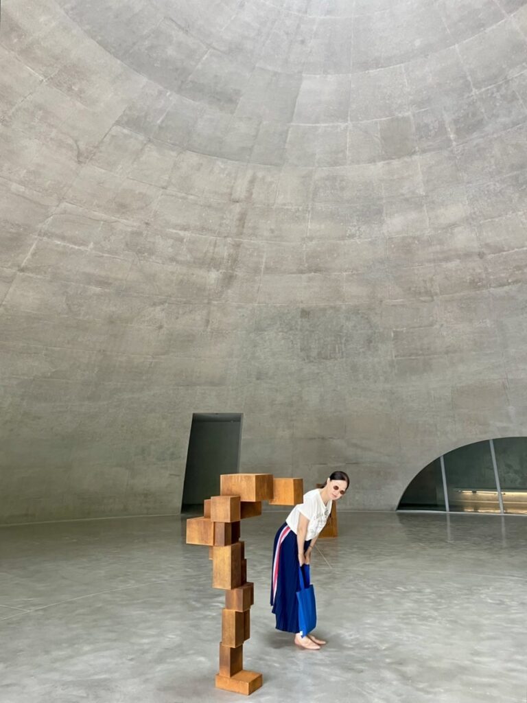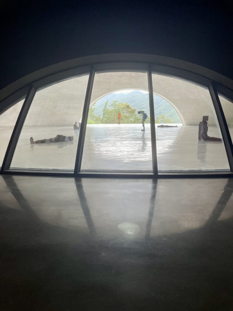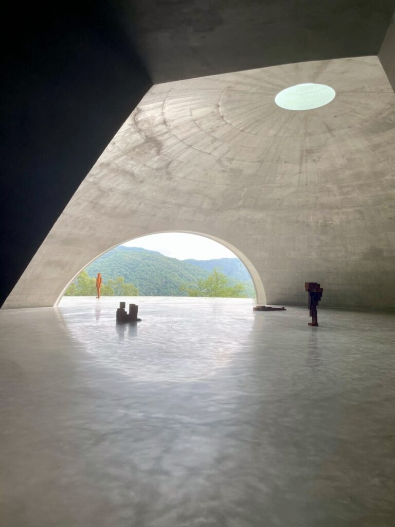 안도 다다오가 구현한 〈그라운드〉는 안토니 곰리와 잘 어울렸다. 단정한 공간에서 작품이 우뚝 빛났고, 그 안으로 진입한 관객은 숭고한 그 무엇과 마주하는 기분이다. 한차례 단체 관람객들이 들어왔고, 공명하는 소리로 공간의 부피가 달라졌다. 그러다 쑥 빠져나간 공간에 고요와 적막이 찾아왔다. 곰리가 말하고 싶었던 존재적 고독이 휙 들어왔다. 그것도 안도 다다오의 공간에서. 돔 밖에는 산과 바람, 빗방울이 적막하게 기다린다. 심지어 햇빛까지 쏟아져 천창의 핀 조명도 잠깐 마주했다. 아주 좋았다는 얘기다.